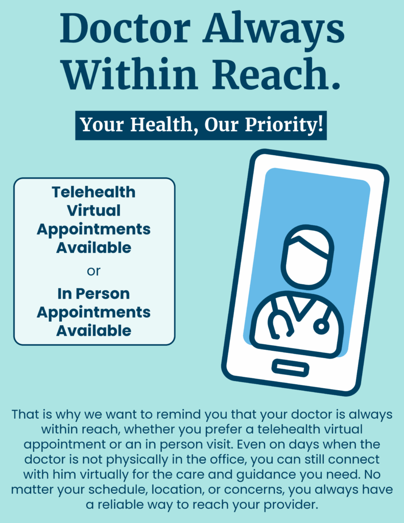 Your healthcare should fit your life, not the other way around. That is why we want to remind you that your doctor is always within reach, whether you prefer a telehealth virtual appointment or an in person visit. Even on days when the doctor is not physically in the office, you can still connect with him virtually for the care and guidance you need. No matter your schedule, location, or concerns, you always have a reliable way to reach your provider.